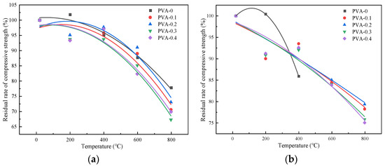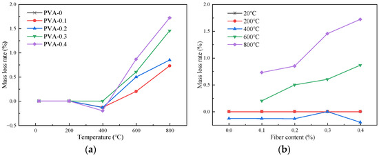 Figure 5b presents the change of the mass loss rates of the samples with different fiber contents under the immersion cooling condition after the high-temperature action. It is evident from the figure that, at the temperatures of 20 °C and 200 °C, the mass loss rates of all the specimens were 0%. When the temperature was between 200 °C and 400 °C, the mass loss rate values decreased, but the change was not obvious. When the temperature was 600 °C and 800 °C, the mass loss rate values enhanced with the increase in the fiber content. This is because the PVA fiber will undergo a thermal decomposition reaction at high temperature. The greater the temperature is, the swifter the rate of thermal decomposition reaction is; thus, the mass loss rate will increase accordingly [30].