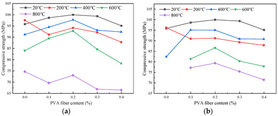 Specifically, when the heating temperatures were 20 °C~600 °C, taking specimens with a fiber content of 0.2% as an example, the compressive strengths under the action of natural cooling were 99.99 MPa, 94.14 MPa, 97.74 MPa, and 92.79 MPa, respectively. The compressive strengths using the immersion cooling method were 99.99 MPa, 91.17 MPa, 95.04 MPa, and 86.58 MPa, respectively. The compressive strength under the natural cooling condition exceeded that using the immersion cooling method. This is because immersion cooling would rapidly reduce the temperature of the exterior of the specimens, while the internal temperature would still be higher, resulting in the temperature stress inside the specimen, which progressively increased as the temperature increased. Cracks appeared inside the concrete and gradually developed outward. Therefore, the decrease in compressive strength with the immersion cooling treatment was greater than that of the concrete using the natural cooling method [33]. From 600 °C to 800 °C, the compressive strength cooled by immersion in water decreased slowly, because the main components after the decomposition of the specimens were CaO and SiO2, which could form hydrated crystals such as Ca(OH)2 in water, thus enhancing the compressive strength. For the specimens with the natural cooling treatment, the compressive strength decreased rapidly due to the thermal breakdown of Ca(OH)2 resulting from cement hydration.