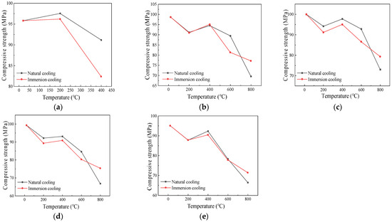 Influence curve of cooling method on compressive strength of specimens with different fiber contents: (a) 0%; (b) 0.1%; (c) 0.2%; (d) 0.3%; (e) 0.4%.