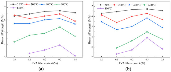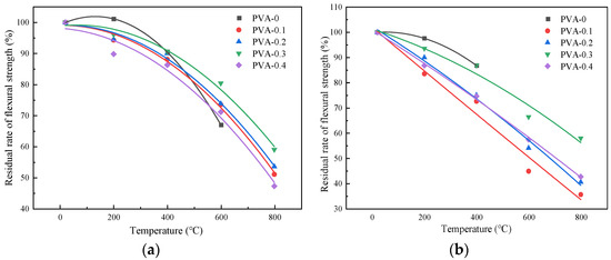 - As the temperature increased, the flexural strength of the PVA fiber-reinforced HSC gradually decreased after the action of natural cooling and immersion cooling, while the flexural strength initially increased and then decreased with the increase in the fiber content. When the PVA fiber content was 0.3%, the flexural strength obviously improved. This may be because lower fiber content can fully exert the bridging effect of fibers, while excessive fibers are not conducive to the uniform distribution of the cement slurry.
