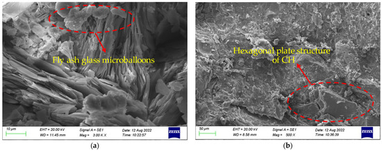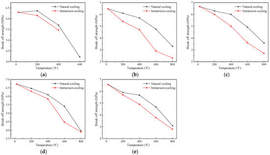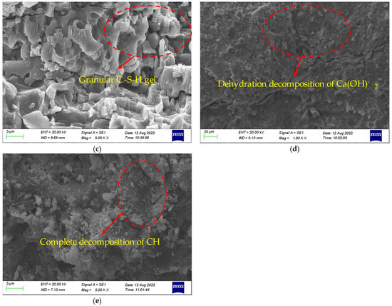 The change of composition under the action of different temperatures is given in Figure 16. At room temperature, the microstructure of the cement paste was complete, and unhydrated fly ash glass beads could be seen, as shown in Figure 16a. In Figure 16b, the C-S-H gel is decomposed, and the bound water and crystal water in the cement slurry were also decomposed by heat, while the microstructure began to show a loose state. When the temperature continued to increase, the cement paste showed obvious porosity and the number of microcracks increased significantly. However, at this time, all the cement was hydrated, and the newly generated hydration products improved the compressive strength of the concrete to a certain extent, which can be seen in Figure 16c. When the temperature was 600 °C, a large amount of Ca(OH)2 was dehydrated and decomposed, and the network structure of the gel was destroyed, as shown in Figure 16d. At this time, there were more cracks appearing, and the compressive strength decreased greatly. In Figure 16e, it can be seen that the cement paste was completely decomposed, and a large number of small cavities were generated inside the cement slurry. At this moment, the compressive strength decreased more obviously.