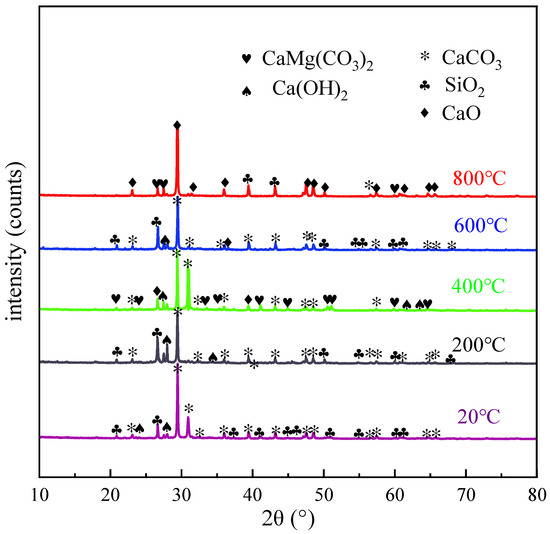 At temperatures of 600 °C~800 °C, the diffraction strength of CaCO3 decreased continuously, indicating that its content gradually decreased after the high-temperature action, and the macroscopic observation indicated a decrease in compressive strength as the temperature increased. As the hydrated calcium silicate gel continued to dehydrate, Ca(OH)2 was decomposed into CaO, and CaCO3 and dolomite (CaMg(CO3)2) were decomposed. The equations are as follows: