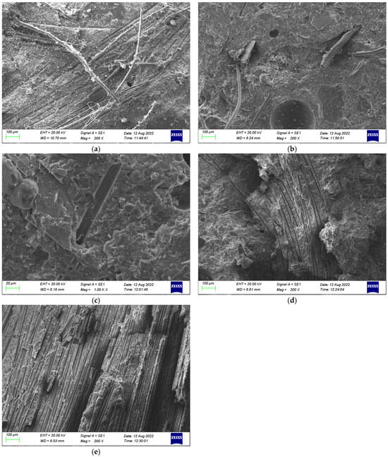 In this paper, the microstructural changes of the concrete under different temperature conditions were analyzed using a specimen with a fiber content of 0.2%, as given in Figure 17. At room temperature, the bonding performance between the fibers and concrete was relatively good (Figure 17a). At a temperature of 200 °C, although the fibers did not melt, gaps began to appear between the fiber and cement paste, as shown in Figure 17b. As the temperature continued to increase, the pores left by the melting of fibers could be seen in the SEM images, and cracks gradually began to appear in the cement paste (Figure 17c,d). When the temperature reached 800 °C, a large number of cracks began to appear in the cement paste (Figure 17e), and the macroscopic performance of the HSC showed a trend of a rapid decline in the mechanical properties.
