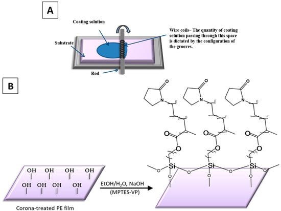 Mayer rod coating system (A) and P(MPTES-VP) thin coating of PE film (B).