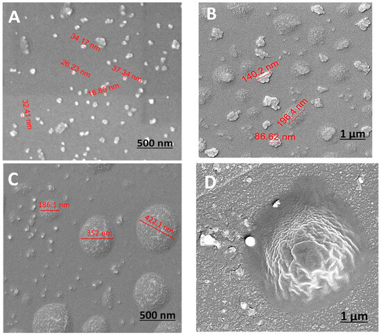 HRSEM surface images (Figure 3) were used to evaluate the diameters of the particles as well as the surface morphology. HRSEM revealed variations in topography, illustrating the evolution of particle structure over time. Figure 3 shows that the obtained particles do not exhibit a distinct round shape, and over time, the range of diameters increases from nano to micron size. Initially, relatively monodispersed nano-sized particles were observed in the first minute, ranging from 15 to 50 nm in diameter (Figure 3A,B). However, after 5 and 30 min, micron-sized particles of a very broad size distribution (between 0.2 and 0.7 μm) were also observed (Figure 3B,C), accompanied by the noticeable presence of aggregates. Figure 3D illustrates the clear morphology of the PVP coating layer on a micron-sized particle after 1 h.