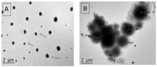 The nanoparticles and microparticles were structurally characterized (size and morphology) with a JEM-1400 instrument (JEOL, 120 kV, Tokyo, Japan). As described above, P(MPTES-VP) particles in EtOH/water were centrifuged (14,000 rpm, 10 min) and redispersed in ethanol repeatedly; a drop was placed on a copper grid and air-dried for 48 h.