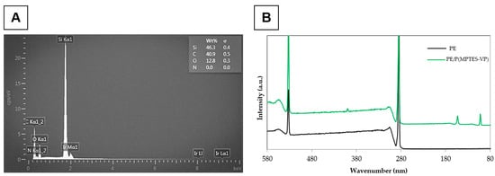 EDS (A) and XPS (B) of PE alone and coated with P(MPTES-VP) particles (60 min of aging).