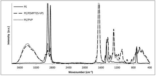 FTIR/ATR spectra of oxidized PE, PE/P(MPTES-VP) and PE/PVP films.