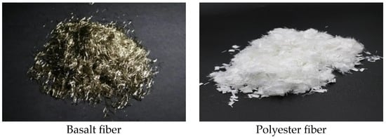 The types of fibers used in this study include basalt fibers and polyester fibers. The basalt fibers were procured from China Jilin Tongxin Basalt Technology Co., Ltd., while the polyester fibers were sourced from China Yancheng Oulu Hua Fiber Technology Co., Ltd. The shapes and appearances of these two fibers are depicted in Figure 1, and their respective technical specifications are detailed in Table 1 and Table 2.