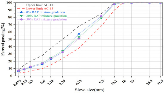 This study employed the Marshall design method to prepare asphalt mixture specimens, with all mixtures designed according to the grading range recommended by []. The asphalt mixture gradation is shown in Figure 2, and the molding method is illustrated in Figure 3. The optimal new asphalt contents for asphalt mixtures with RAP contents of 0%, 30%, and 50% were determined to be 4.6%, 3.5%, and 2.9%, respectively. Furthermore, to ascertain the impact of fibers on asphalt mixtures, the optimal new asphalt contents were controlled at 3.5% and 2.9% when fibers were added to asphalt mixtures containing 30% and 50% RAP, respectively. Furthermore, based on existing research conclusions, fiber content generally ranges from 0.1% to 0.6% of the total mass of the asphalt mixture [,]. To compare the effects of two different types of fibers on RAP material performance, a fiber content of 0.3% of the total mass of the asphalt mixture was selected.