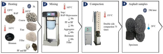 - Ma, X.; Leng, Z.; Wang, L.; Zhou, P. Effect of Reclaimed Asphalt Pavement Heating Temperature on the Compactability of Recycled Hot Mix Asphalt. Materials 2020, 13, 3621. [Google Scholar] [CrossRef]
