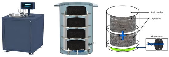 Dynamic pore water pressure-induced asphalt pavement moisture damage is more common in areas with abundant rainfall. When vehicles travel on roads with surface runoff, it creates a dynamic pore water pressure environment, leading to erosion processes such as dynamic water scouring on the asphalt pavement []. Therefore, this study conducted dynamic water scouring tests to simulate the effects of vehicle loading-induced dynamic water erosion on asphalt pavement under the conditions of hot and rainy summers. The moisture-induced sensitivity tester equipment shown in Figure 4 was used in this study. The dynamic water pressure adjustment cycle was approximately 4 s, with a constant loading frequency of 0.25 Hz. The test was set to 3500 cycles, with a pressure value of 276 kPa, and a temperature setting of 60 °C. After the test, the specimens were placed in a constant temperature water bath at 25 °C ± 1 °C for 2 h. The indirect tensile strength test was used to evaluate the change in strength before and after dynamic water scouring.