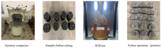 The inclusion of a high proportion of RAP increases the stiffness and brittleness of asphalt mixtures, making them more susceptible to brittle failure in low-temperature environments. This study utilized the semi-circular bend (SCB) test to assess the low-temperature cracking resistance of asphalt mixtures. Cylindrical asphalt mixture specimens with a diameter of 150 mm and a height of 160 mm were prepared using a gyratory compactor. These specimens were subsequently cut into semi-circular specimens with a diameter of 150 mm, a radius of 75 mm, a thickness of 50 mm, and pre-cut notches with a depth of 15 mm and a width of 1.5 mm. Each cylindrical specimen could be cut into four semi-circular specimens. The temperature was set at −10 °C, and the specimens were kept in a temperature-controlled environment for at least 6 h. A loading rate of 1.2 mm/min was applied, and the test was terminated when the load was less than 0.1 kN, with continuous recording of the load–displacement curve. In this study, fracture energy (Gf) and fracture toughness were computed to characterize the cracking behavior of fiber-reinforced asphalt mixtures. The experimental procedure is illustrated in Figure 5.