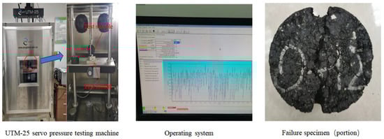 This study utilized the indirect tensile fatigue test to assess the fatigue performance of fiber-reinforced asphalt mixtures. The indirect tensile fatigue test was conducted using a UTM-25 servo-hydraulic testing machine by the Australian manufacturer IPC Global. Specimens were prepared by gyratory compaction with 100 gyrations, resulting in specimens with a diameter of 101.6 mm and a thickness of 63.5 mm. The tests were performed at a temperature of 25 °C in stress control mode, applying a pulsating semi-sine wave load at a frequency of 10 Hz with an interval time of 0.1 s, and a stress ratio of 0.4. The experimental process is depicted in Figure 6 [].