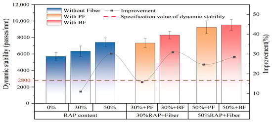 - As the RAP content increases, the dynamic stability of asphalt mixtures improves. Furthermore, the addition of polyester fiber and basalt fiber creates a spatial network structure within the asphalt mixture, enhancing its shear strength and improving its high-temperature stability. Basalt fiber demonstrates a more significant enhancement effect compared to polyester fiber;