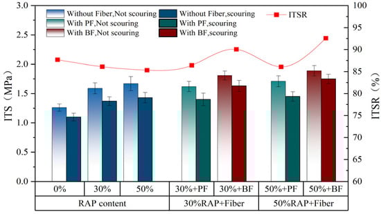 Figure 8 presents the ITS and ITSR before and after dynamic water scouring. As indicated by the red line in Figure 8, in the control group without fibers, there is a noticeable decrease in ITSR of the asphalt mixture with increasing RAP content. When the RAP content increases from 0% to 50%, the ITSR value decreases from 87.7% to 85.3%. However, after the addition of polyester fiber and basalt fiber, ITSR shows an overall increasing trend, which is consistent with the findings of Li et al. []. Fibers can enhance the bonding between asphalt and aggregate, improving the water damage resistance of asphalt mixtures. Notably, basalt fiber demonstrates the most significant improvement, increasing to 90.06% and 92.59% at RAP contents of 30% and 50%, respectively. In contrast, the enhancement effect of polyester fiber is relatively limited, with ITSR increasing to 86.42% and 86.1% at the same RAP contents. Additionally, according to the bar chart in Figure 8, both fibers enhance the ITS of specimens, with basalt fiber showing more pronounced improvement.