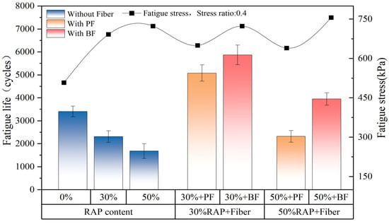Figure 9 illustrates the improvement in fatigue life of asphalt mixtures with different RAP contents due to basalt fiber and polyester fiber, as well as the fatigue stress at a stress ratio of 0.4. As shown by the black line in Figure 9, in the control group without fibers, the tensile strength of the asphalt mixture increases with the rise in RAP content. This may be attributed to the higher RAP content, which leads to an increased presence of aged asphalt in the mixture, thereby increasing its hardness and brittleness. However, the enhancement effect of polyester fiber on the tensile strength of the asphalt mixture is not significant. As indicated by the bar chart in Figure 9, the addition of both fibers increases the fatigue life of the asphalt mixture. Basalt fiber improves the fatigue life by 154% and 135% at RAP contents of 30% and 50%, respectively. In comparison, polyester fiber increases the fatigue life by 119% and 38% at the same RAP contents. This is consistent with the findings of Zhu et al. [], who reported that under the same stress ratios, asphalt mixtures containing basalt fibers have higher fatigue life than those containing polyester fibers. One reason for this may be that, similar to high-temperature rutting tests, basalt fibers can better adsorb asphalt, forming a stable spatial network structure. Another reason may be that basalt fibers have higher tensile strength and modulus of elasticity compared to polyester fibers, thereby significantly enhancing the fatigue life of the asphalt mixture.