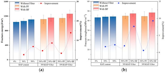 Figure 10 presents the results of semi-circular bending tests on asphalt mixtures with basalt fiber and polyester fiber at different RAP contents. At −10 °C, the results of fracture energy testing are shown in the bar chart in Figure 10a. In the control group without fibers, the fracture energy of the asphalt mixture increases with the rise in RAP content. This phenomenon occurs because, at −10 °C, the asphalt mixture exhibits a brittle state with a high modulus, and the displacement at failure is minimal. Consequently, the material is more influenced by stress than by strain [,]. Increasing RAP content under low-temperature conditions increases the hardness and load-bearing capacity of the asphalt mixture, thereby enhancing fracture energy. Additionally, as indicated by the red line in Figure 10a, the addition of both types of fibers can increase the fracture energy of the asphalt mixture. Compared to polyester fiber, basalt fiber shows a more pronounced enhancement effect. In contrast, basalt fibers increased the fracture energy of asphalt mixtures with 30% and 50% RAP content by 8.63% and 13.9%, respectively, compared to those without fiber reinforcement. Meanwhile, polyester fibers at the same RAP content enhanced the fracture energy of asphalt mixtures by 4.66% and 3.35%, respectively. This enhancement is attributed to the significant influence of interfacial strength on the fracture energy of asphalt mixtures. Basalt fibers, possessing higher surface energy, enable tighter bonding with the asphalt binder, thus achieving higher interfacial strength. Therefore, basalt fibers are more effective in enhancing the fracture energy of asphalt mixtures [,]. Similarly, comparable results are observed in Figure 10b for fracture toughness. Fracture toughness is mainly influenced by the ultimate load, and the addition of RAP can improve the hardness of the mixture, thereby increasing the ultimate load. Moreover, basalt fiber may form a more stable network structure and have higher tensile strength in the mixture than polyester fiber, thus significantly enhancing the fracture toughness of the asphalt mixture under low-temperature conditions [,].