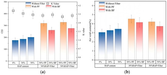 Compaction density is a critical indicator during the construction of asphalt mixtures and plays a crucial role in the pavement’s longevity. Asphalt pavements with poor compaction density are more prone to damages such as cracking, rutting, and stripping []. Additionally, the inclusion of RAP and fibers also affects the compaction difficulty of asphalt mixtures. This study conducted gyratory compaction tests following the guidelines outlined in Chinese standards []. The evaluation of the compaction characteristics of asphalt mixtures concerning the influence of fibers and RAP utilized indicators such as the CEI, K value, and air void content []. The CEI refers to the energy required to compact the asphalt mixture from a loose state to a preliminary compaction (92%). A higher CEI signifies increased compaction difficulty for the asphalt mixtures. Analysis from gyratory compactor data reveals that the compaction density of asphalt mixtures follows a semi-logarithmic curve across compaction cycles. The average slope of this curve, represented by the K value, indicates the compaction rate: a higher K value suggests better compaction performance. In this experiment, the initial compaction cycle was set to 8 cycles, and the design compaction cycle was 100 cycles. To ensure that the air void content of the specimens did not vary due to changes in specimen mass, the mass of all specimens was standardized to approximately 1180 g.