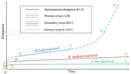 The raw material of HDPE geomembrane is a high-molecular, semi-crystalline polymer formed by crystalline and amorphous regions [,,,,]. The special structure of crystalline and interlayer amorphous chains gives HDPE geomembranes a viscoelastic-plastic material behavior []. Under different load levels, the creep stages of polymeric materials display various characteristics. According to Koerner et al. [], the creep behavior of HDPE geomembranes can be divided into four stages, namely instantaneous (O–A), primary (A–B), secondary (B–C), and tertiary creep stage (C–D–E), as illustrated in Figure 1. After instantaneous elongation, polymeric materials enter the primary creep stage first. Under low load levels, creep strain tends to stagnate in the secondary creep stage, while under medium load levels, creep strain increases almost linearly with time. Under high load levels, the material enters the tertiary creep stage after maintaining a relatively constant creep rate for a period of time in the secondary stage. Creep strain in the tertiary creep stage increases sharply with time until creep rupture occurs.