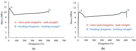 In order to explore the one-dimensional tensile behavior of the HDPE geomembrane used, material displacement-controlled tensile tests with a UTM4503 tensile tester were carried out on specimens with an initial length of 100 mm, a width of 50 mm, and two different thicknesses. The HDPE geomembrane material used in the laboratory experiments was manufactured by Material Co., Ltd. in Dezhou, Shandong, China. The tests were conducted with a constant displacement velocity of 0.334 mm/s. For both specimen thicknesses, namely 0.5 mm and 1.5 mm, the stress-elongation relations are shown in Figure 2, and the quantities of peak strength, breaking strength, and corresponding elongations are summarized in Table 1. For the representation of the test results, nominal stresses and strains are considered.