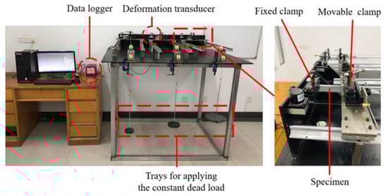 For creep tests on HDPE smooth geomembrane specimens with an initial length of 100 mm and an initial width of 50 mm, a dedicated test apparatus was developed at Hohai University, as shown in Figure 3. It is equipped with three different devices: the loading device, the clamping device, and the deformation measurement device. The geomembrane specimen is installed horizontally by a fixed clamp and a movable clamp. In order to avoid the influence of gravity, the clamps are mounted horizontally. The movable clamp can slide freely on the horizontal rail. The loading plate is connected to the movable clamp by a steel cable which is guided over a pulley. In each test, the weight was placed on the trays in one step and kept constant during the whole geomembrane creep test. The data acquisition device is composed of a WFS displacement sensor with a resolution of 0.1 mm and an acquisition device. The WFS displacement sensor is a product of Suzhou Fangyi Electric Co., Ltd., Suzhou, China. The acquisition device records measurements at intervals of 1 s. A personal computer is used to store the test data.