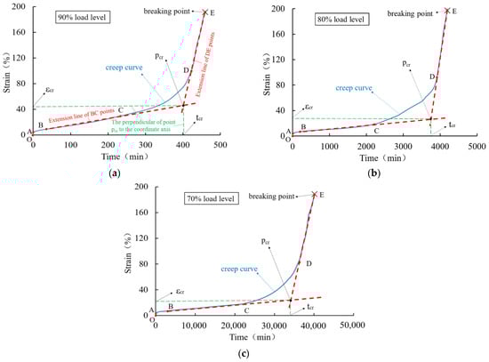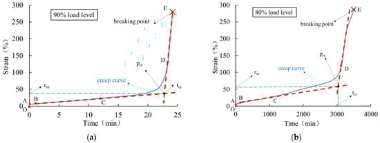 From Figure 6 and Figure 7, it is clear that immediately after instantaneous deformation (section O–A), time-dependent creep strain develops in a non-linear manner until creep rupture takes place. In the primary creep stage (section A–B), the curve is concave, and at the turning point B, it assumes a convex shape, indicating an increase in creep velocity. In particular, within the secondary creep stage (section B–C), creep velocity is almost constant and can be approximated in a simplified manner by the red dotted line shown in Figure 6 and Figure 7. The course of the rapid creep growth stage (section D-E) can also be approximated by a straight line. It is obvious that for all load levels, the inclination of the second line (D–E) is much steeper than that of the secondary creep stage (section B–C). Following the concept by Liu [] and other scholars, the intersection of the extended lines is defined as the “critical creep point” (pcr), and the corresponding time (tcr) and strain (εcr) denote the “critical creep time” and “critical creep strain”, respectively. The corresponding values under different load levels and for the 0.5 mm and 1.5 mm thick membranes are summarized in Table 2.