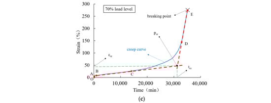 Considerable research has been conducted to appraise the result of creep tests of polymer materials and to propose mathematical models to simulate the experimental data [,,]. However, only a few studies focus on creep failure characteristics under high load levels [].