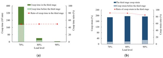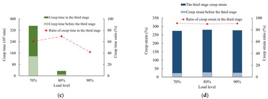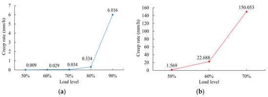 Under different load levels, a comparison of creep rates in the secondary creep stage and the rapid creep growth stage is shown in Figure 12a and Figure 12b, respectively. The creep rate in the secondary creep stage increases slowly when the load level is less than 70%, but it increases rapidly when the load level is higher than 70%. Under high load levels of 70%, 80%, and 90%, the creep rate in the secondary creep stage increases with increasing load levels. The creep rate in the rapid creep growth stage increases significantly with increasing load level, and the creep rate is much greater than that in the secondary creep stage under the same load level.