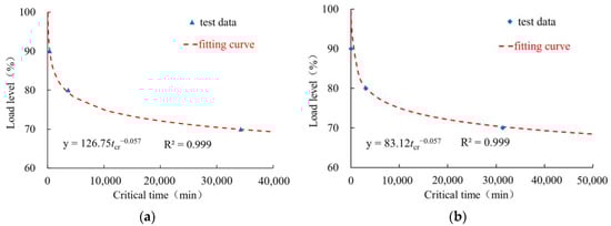 Here, σp is the load level, and a and b are the fitting parameters. In particular, for the initial geomembrane thicknesses of 0.5 mm and 1.5 mm, the fitted curves are shown in Figure 9a and Figure 9b, respectively. For the different geomembrane thicknesses, the values of parameter a are different, which again indicates a size effect, as discussed above.