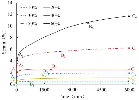 The creep curves for 0.5 mm thick HDPE geomembranes obtained under low and medium load levels of 10%, 20%, 30%, 40%, 50%, and 60% are shown in Figure 10. Each of the creep curves only experiences instantaneous deformation, the primary creep stage, and the secondary creep stage, but not the tertiary creep stage. All curves exhibit a concave shape with decreasing creep velocity over time. It can, therefore, be concluded that under ordinary temperature, the creep characteristics of geomembrane typical in tertiary creep stages can only be observed under very high load levels. The experimental results for a 0.5 mm thick HDPE geomembrane reveal that under low load levels of up to 40%, creep strain after 100 h is already less than 3%, and it can thus be expected that the geomembrane will not enter the tertiary stage in a finite period of time and creep rupture will not occur within the usual lifetime of geotechnical structures.