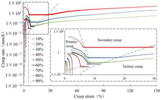 The geomembrane under medium load levels, i.e., between 50% and 60%, displays an almost constant rate in the secondary creep stage. In order to analyze the evolution of creep rate under low, medium, and high load levels, it is convenient to construct a Sherby–Dorn plot, as shown in Figure 11, for the 0.5 mm thick geomembrane. Independent of load level, the creep rate significantly decreases in the primary creep stage. In the secondary creep stage, the decrease in creep rate tends almost to zero under low load levels. Under high load levels, the creep rate in the secondary stage increases slightly, and in the tertiary creep stage, it increases until creep rupture takes place.