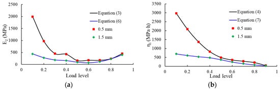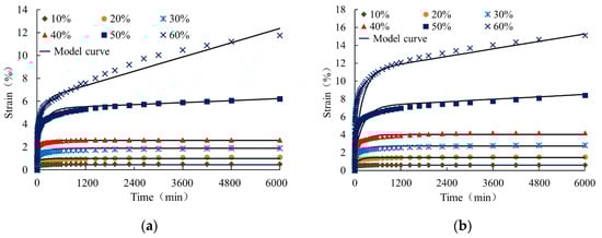 Figure 13 shows the fitting of creep curves under different load levels using the four-element viscoelastic model (2) and the material parameters of Table 4.