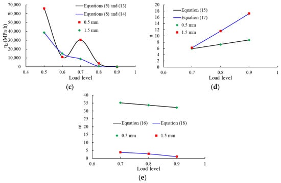 Course of parameters depending on the load level for membrane thicknesses of 0.5 mm and 1.5 mm, respectively (shapes denote experimental data, solid curves denote the fitting data): (a) E2; (b) η1; (c) η2; (d) n; (e) m.