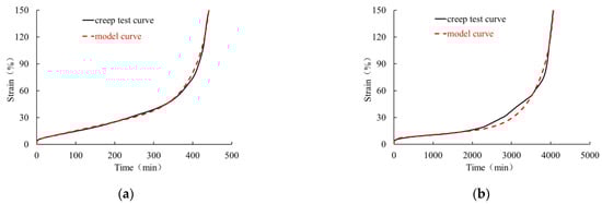 Figure 15 and Figure 16 show the comparison between the experimental data and the curves obtained with the numerical model. The simulations with the extended model (12) are in good agreement with the experimental creep curves, indicating that the improved mathematical model can reasonably reflect the whole creep behavior of the geomembrane under high load levels. In the logarithmic time scale, the model curves and test curves under different high load levels display the characteristics of the initial period of flatness and the rapid rise in strain in the tertiary stage up to creep rupture. Thus, for high load levels, the improved mathematical description (12) can capture the initially slow creep process as well as the non-linear rapid increase in creep strain after passing the secondary stage.