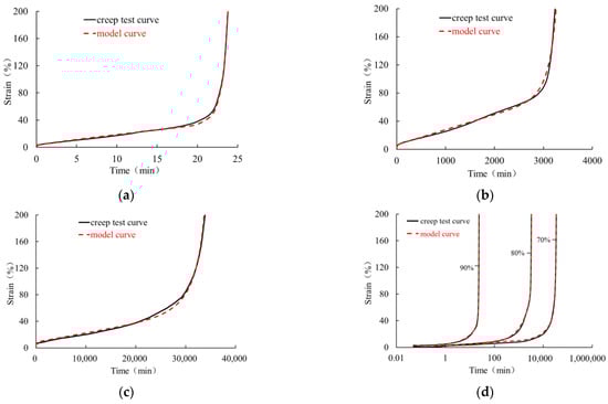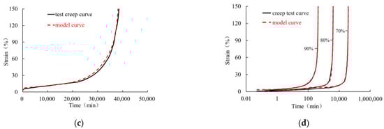 Comparison of creep tests (solid curves) and simulations (dashed curves) of a 0.5 mm thick HDPE geomembrane under a load level of (a) 90%, (b) 80%, (c) 70%, and (d) representation in a semilogarithmic coordinate system.