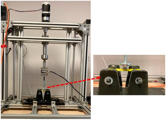 The three-point flexural samples were produced using the Creality Ender 3-S1 Pro printer (Shenzen, China), which prints using the FFF method and has a nozzle diameter of 0.4 mm. The printing process used a Creality PETG filament with a diameter of 1.75 mm and a density of 1.27 g/cm3. The experimental design and the RSM analyses were conducted using Minitab, Version 20.3. The flexure tests were performed on a custom-built table-top testing machine designed for low-strength materials (Figure 1). The device is controlled by an Atmega2560 microcontroller (Microchip, Chandler, AZ, USA) and uses C++ for its software development. The user interface software was developed in C# (Microsoft Visual Studio 2022). Although the test device has a maximum load-carrying capacity of up to 1.5 kN, a 0.3 kN capacity load cell (Tedea, Shaanxi, China) is used to get more accurate measurements. A stepper motor was used to drive the loading head. This allowed the system to be controlled using open-loop control. The configuration settings for the motor drivers were set to 1600 pulses per revolution with a screw pitch and reduction ratio of 5, allowing precise loading head positioning in increments as small as 1/1600 mm. Displacement data acquisition involved tracking the position of the loading head. The data-acquisition card, which employed an ADS1256 from Texas Instruments, USA, was configured to operate at a sampling rate of 30 data points per second.