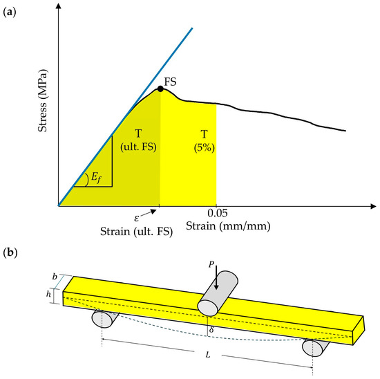 The relevant formulas used in the calculations are shown in the equations below (Equations (1)–(4)) [35,36]. Flexural strength () and flexural strain () can be obtained as follows: