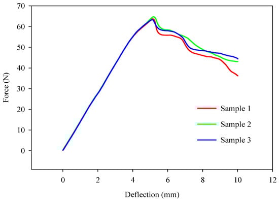 Three bending force-deflection curves with the same manufacturing process parameters are shown in Figure 3 as representative curves. This pattern was observed across other experimental groups as well. When repeated tests yield highly similar results, the standard deviation within the experimental groups will be low. This indicates reliable outcomes and suggests that fewer experiments may be necessary for a robust experimental design. So, Box–Behnken design type, which requires fewer experiments, was chosen for the response surface analysis [37].