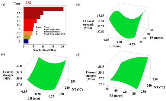 Flexural strength provides information on the strength of the material using the ultimate load generated during the flexure test. Figure 4 shows the Pareto chart and the effects of layer height, print speed, and nozzle temperature on flexural strength. Figure 4a presents the Pareto plot of flexural strength. According to the Pareto plot of flexural strength, the order of influence is nozzle temperature, layer height*layer height, and print speed*nozzle temperature. The ANOVA results in Table 4 reveal that this effect is caused by 56.64% nozzle temperature, 14.24% layer height*layer height, and 9.99% print speed*nozzle temperature. The p-value of layer height for flexural strength (0.056) is higher than 0.05, indicating that the effect of the layer height on flexural strength is insignificant. Figure 4b–d shows the simultaneous impacts of layer height, print speed, and nozzle temperature on flexural strength. Figure 4c,d illustrates flexural strength increases with increasing temperature. It was also observed that the compression speed of about 50 mm/s provided the highest flexural strength (Figure 4b,d). The highest flexural strength value was obtained as 38.91 MPa in Sample 3 with a 250 °C nozzle temperature, 50 mm/s print speed, and 0.25 mm layer height parameters (Table 3).