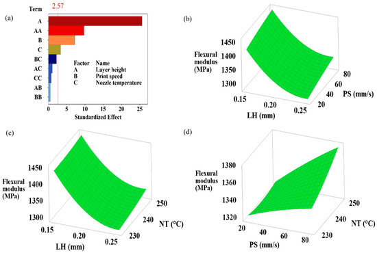 (a) Pareto chart and (b–d) simultaneous impacts of layer height, print speed, and nozzle temperature on flexural modulus.