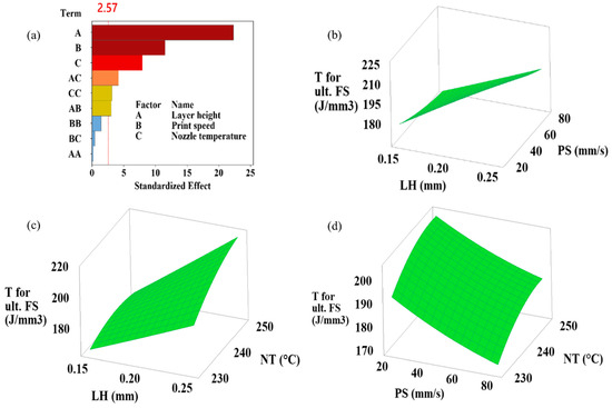 (a) Pareto chart and (b–d) simultaneous impacts of layer height, print speed, and nozzle temperature on flexural toughness for ultimate flexural strength.