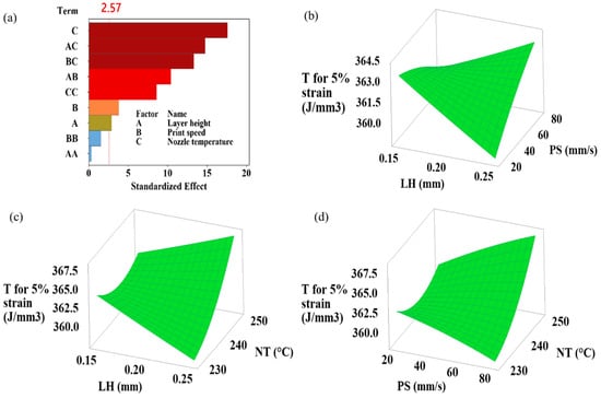 Figure 7 shows the Pareto chart and 3D plots of flexural toughness for 5% strain according to layer height, print speed, and nozzle temperature. As shown in Figure 7a, the maximum effect on flexural toughness at 5% strain is due to nozzle temperature and the interaction of nozzle temperature with layer height and print speed. According to Table 5, which shows the results of ANOVA, the nozzle temperature has an effective rate of 33.62%, the layer height is 0.91%, and the printing speed is 1.57%. The nozzle temperature/layer height interaction had an effect of 23.68%, while the print-speed interaction had an impact of 19.28%. Flexural toughness at 5% strain increased with increasing nozzle temperature. In particular, for the 0.25 mm layer height and 80 mm/s print speed parameters, the increase in flexural toughness at 5% strain was more significant with increasing nozzle temperature (Figure 7c,d). Changes in layer height and print-speed parameters have mixed effects regarding the increases and decreases in flexural toughness at 5% strain (Figure 7b–d). The highest flexural toughness for the 5% strain value was obtained as 368.48 J/mm3 at 0.20 mm layer height, 80 mm/s print speed, and 250 °C nozzle temperature.