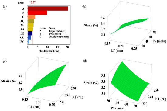 Figure 8 shows the simultaneous effects of layer height, print speed, and nozzle temperature on strain at ultimate flexural strength. In addition, the degree of influence of the variables on the strain (%) is provided in Figure 8a. The Pareto plot for strain shows that layer height is the most influential parameter, followed by print speed and nozzle temperature. The ANOVA results show that the contribution of layer height to strain is 73.23%, the print speed is 16.91%, and the nozzle temperature is 2.62%. The simultaneous effects of the variables show that increasing layer height promotes an increase in strain while increasing print speed promotes a decrease (Figure 8b–d). Nozzle temperature has a limited effect on strain. Based on the test results in Table 3, the highest strain at the ultimate flexural strength value is 3.66% for the parameters of 0.25 mm layer height, 20 mm/s print speed, and 240 °C nozzle temperature.