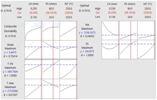 In this study, the multiple responses listed in Table 11 were optimized using the response optimizer according to the stated objectives and as part of the RSM analyses. The main objective was to find the maximum values for all responses. Figure 9 shows the results of the RSM optimizer. The optimum values for strain, toughness at 5% strain, toughness at ultimate FS, flexural modulus, and flexural strength were obtained as 3.45%, 369.74 J/mm3, 215.86 J/mm3, 1336.27 MPa, and 39.05 MPa for optimum input parameters of 0.25 mm layer height, 58.18 mm/s print speed, and 250 °C nozzle temperature, respectively. In optimization studies, the desirability value is expected to be close to 1. The value of 0.7018 in the present study shows an acceptable desirability value. Nevertheless, verification experiments were conducted to prove the accuracy of the optimization study, and the results obtained were compared with those obtained as a result of the optimization. Table 12 shows the optimization results, the validation experiment results, and the error rates between them. The results of the validation experiments were above the predicted values for all outputs. In the verification experiments, for the optimal parameters 3.50%, 381.47 J/mm3, 218.22 J/mm3, 1344.60 MPa, and 39.55 MPa strain, toughness for 5% strain, toughness for ultimate FS, flexural modulus, and flexural strength, respectively, were obtained. When the error rates are analyzed, it can be seen that all of them are less than 1.5% except for toughness at 5% strain. The lowest error rate was obtained in flexural modulus with 0.62%, while the highest error occurred in toughness at 5% strain with 3.17%.