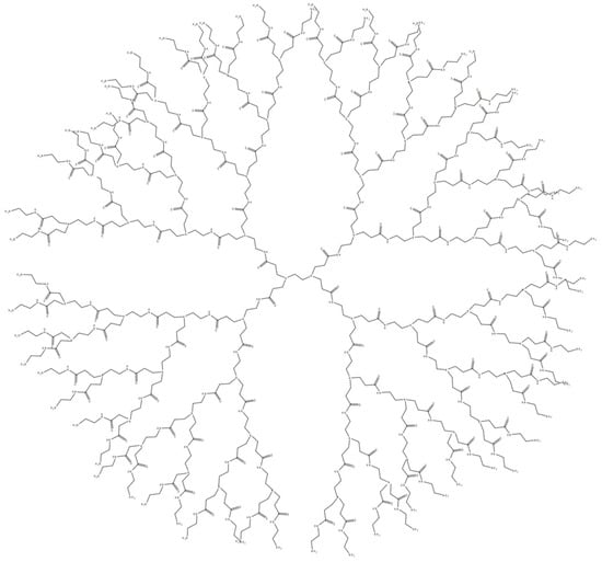 Unlike linear polymers, which often exhibit a random distribution of molecular weights leading to polydispersity [26], PAMAMs display monodispersity, characterized by an identical size and structural uniformity [27]. PAMAM dendrimers have perfectly branched and tree-like configurations. Each generation of the dendrimer is built through a stepwise process where new branches are added in a controlled manner onto the existing structure. As a result, the size, shape, number and type of surface functional groups, as well as their overall physicochemical properties, including their charge, can be meticulously tailored during synthesis [28,29]. The monodispersity and structural precision of the PAMAM dendrimers enable them with several key advantages in biomedical applications: