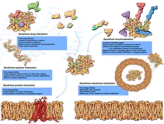 Molecular dynamics of biological interactions of dendrimers. The diagram includes dendrimer-drug interaction, dendrimer functionalization, dendrimer-polymer interaction, dendrimer-protein interaction and dendrimer-membrane interaction. # e.g., in the dendrimer functionalization part stands for an example. Reprinted with the permission of [89].