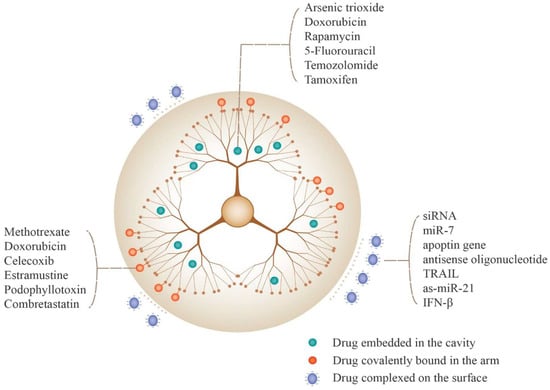 Drug loading to PAMAM is affected by the structure and properties of drugs and the characteristics of PAMAM (Figure 7). There are three main methods: drug encapsulation in the core of PAMAM [90], the formation of complexes between drugs and the PAMAM surface and the covalent connection between drugs and PAMAM branches [91].