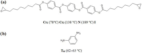Chemical structures of the diepoxy monomer, the curing agent, and their phase transition data: (a) bis [4-(10,11-epoxy undecanoyloxy)benzoate] p-phenylene (LCEM), (b) 1,3-phenylene¬diamine (1,3-PDA); Cr1—crystalline form 1; Cr2—crystalline form 2; N—nematic phase; I—isotropic phase, Tm—melting point (given temperatures are maximum/minimum peaks) [14,19].