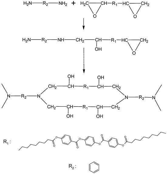 LCEM was cured in a polyaddition reaction with 1,3-PDA. The molar ratio of the mesogenic monomer to the curing agent was 1:2. The samples of the LCEM/1,3-PDA composition were prepared by suspending the appropriate amounts of LCEM and 1,3-PDA in acetone. The homogeneous sample was then subjected to intense shaking for 3 h. Subsequently, the solvent was evaporated under a vacuum at room temperature and the powdered product was stored at 5–10 °C. The schematic representation of this reaction is shown in Figure 2.